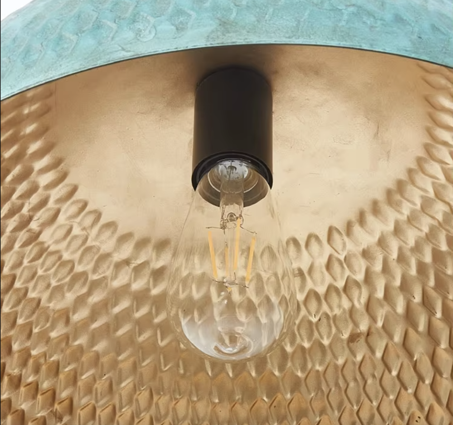 Zewnętrzna powłoka lampy w odcieniu głębokiej, nieregularnej zieleni przywodzi na myśl naturalne patyny i wpływ czasu. Wnętrze klosza, wykończone w ciepłym złocie, subtelnie odbija światło, tworząc atmosferę przytulności i intymności. Forma owalna i delikatne niedoskonałości powierzchni czynią ją idealnym dodatkiem do wnętrz, które stawiają na autentyczność i charakter.