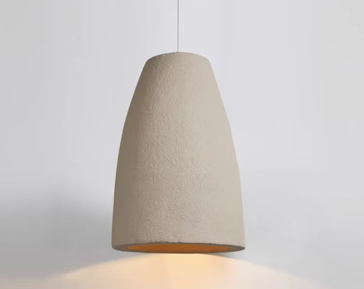 Powierzchnia lampy przypomina surową glinę, a jej matowy, beżowy kolor doskonale współgra z naturalnymi materiałami i neutralnymi tonacjami wnętrza. Klosz w kształcie smukłego stożka subtelnie zwęża się ku górze, przywodząc na myśl zawieszony na nici wisiorek. Lampa jest lekka, ale niezwykle efektowna – idealna do powieszenia nad stołem, w sypialni, kuchni czy przestrzeni wypoczynkowej.